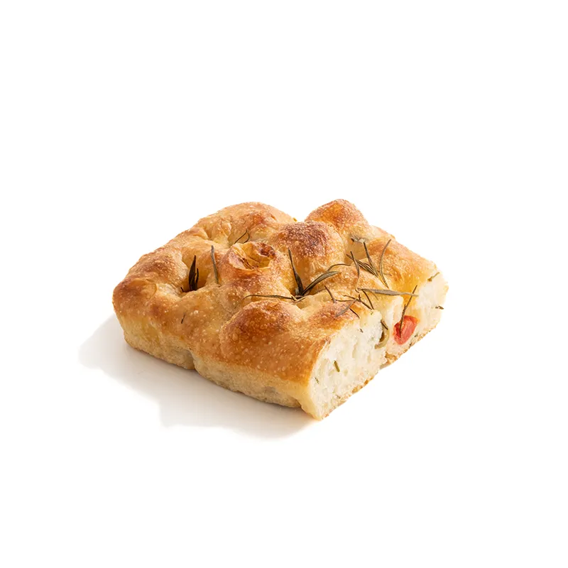مناسب برای یک تا سه نفر، فوکاچیا خمیر ترش با زیتون، گوجه گیلاسی و رزماری، با طول حدودی 20 سانتی متر