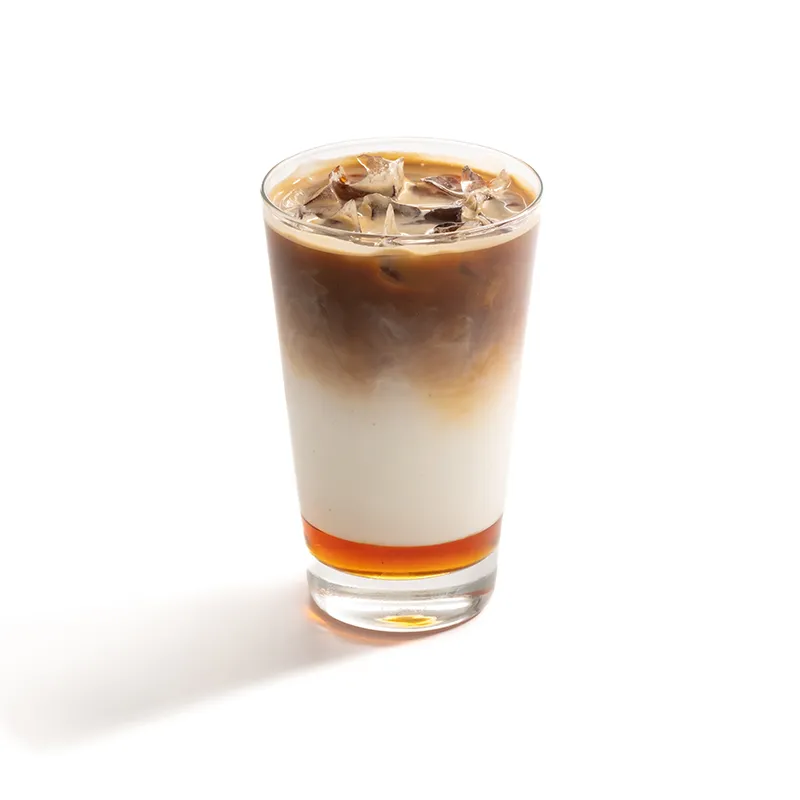 لیوان 360 میلی لیتر، قهوه سرد متشکل از اسپرسو، شیر، سیروپ کارامل و تکه های یخ