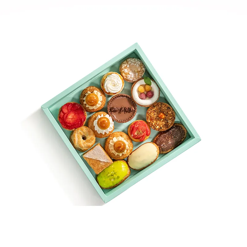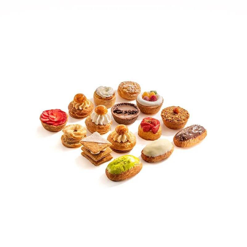 بسته‌ای شامل 15 عدد از شیرینی‌های ما از جمله تارت‌ها و شیرینی‌های کلاسیک فرانسوی  که در اندازه‌ی مینیاتوری آماده شده‌اند.