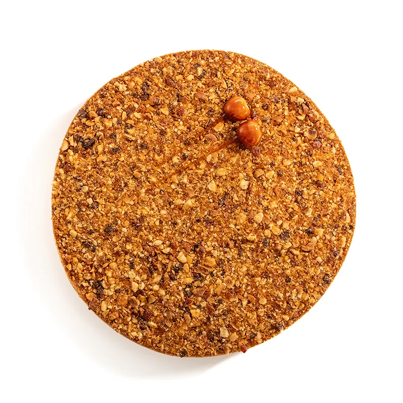 نان تارت شیرین و ترد که با یک لایه میوه موز تازه داخل آن پر میشود و روی آن با کرم موز، فندق و بادام کاراملایز شده پوشانده و در انتها با فندق کاراملی تزئین میشود.